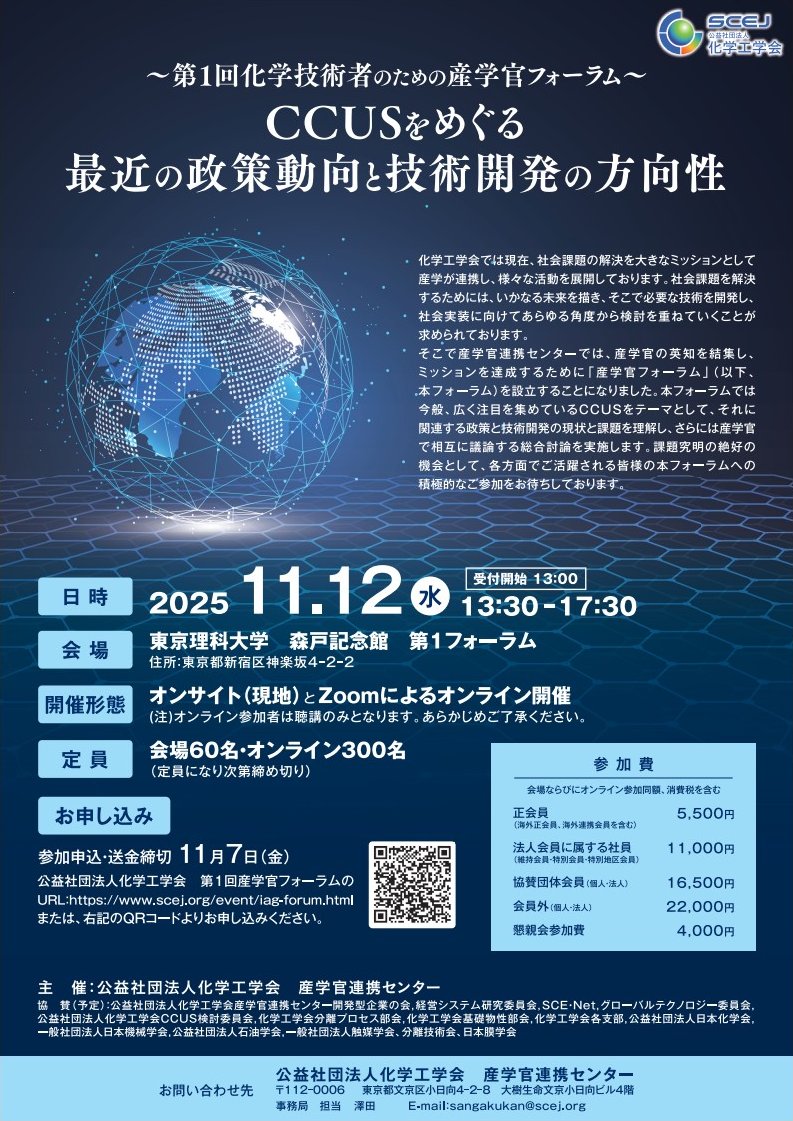 主催:公益社団法人化学工学会 産学官連携センター協賛(予定):公益社団法人化学工学会産学官連携センター開発型企業の会、経営システム研究委員会、SCE.・Net、グローバルテクノロジー委員会、公益社団法人化学工学会CCUS検討委員会、化学工学会分離プロセス部会、化学工学会各支部、公益社団法人日本化学会、一般社団法人日本機械学会、公益社団法人石油学会、一般社団法人触媒学会、分離技術会、日本膜学会