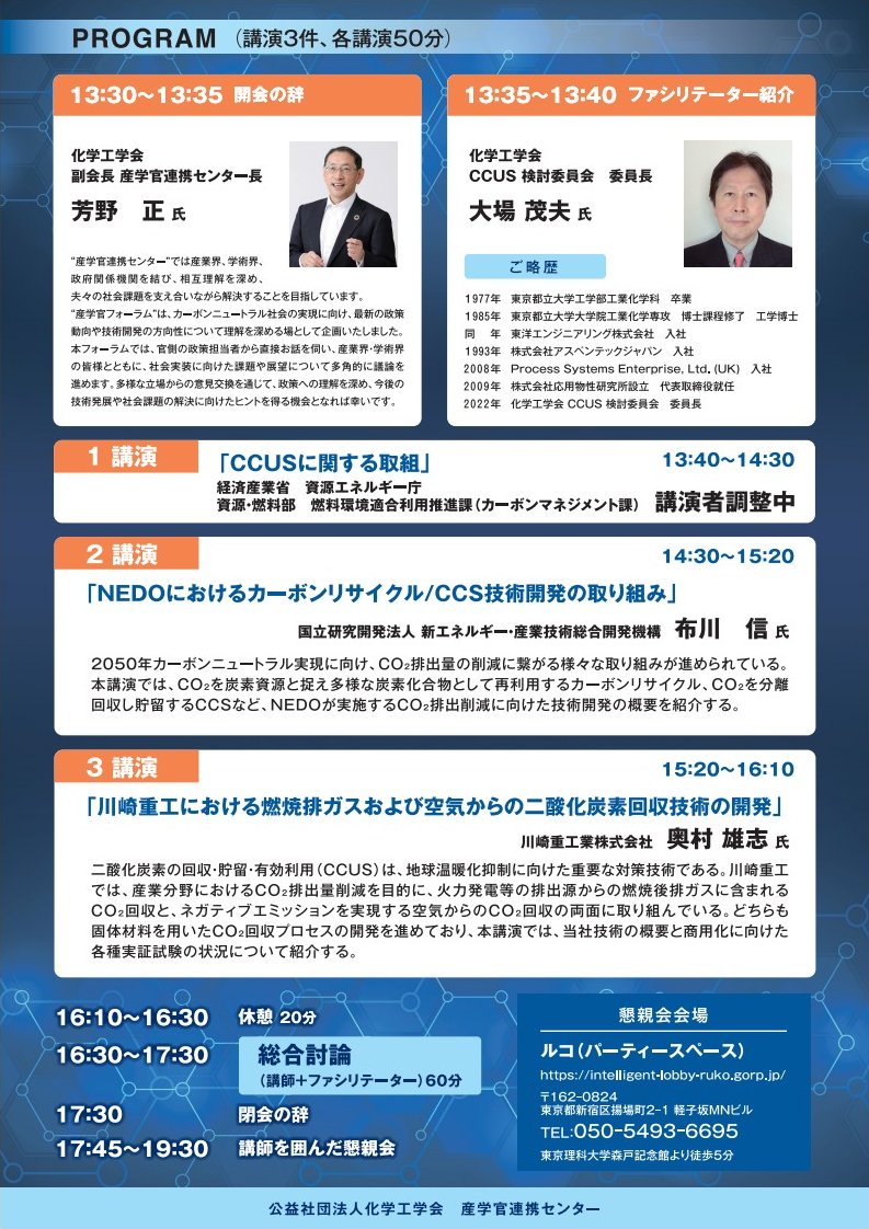 化学工学会では現在、社会課題の解決を大きなミッションとして産学が連携し、様々な活動を展開しております。社会課題を解決するためには、いかなる未来を描き、そこで必要な技術を開発し、社会実装に向けてあらゆる角度から検討を重ねていくことが求められております。そこで産学官連携センターでは、産学官の英知を結集し、ミッションを達成するために「産学官フォーラム」(以下、本フォーラム)を設立することになりました。本フォーラムでは今般、広く注目を集めているCCUSをテーマとして、それに関連する政策と技術開発の現状と課題を理解し、さらには産学官で相互に議論する総合討論を実施します。課題究明の絶好の機会として、各方面でご活躍される皆様の本フォーラムへの積極的なご参加をお待ちしております。